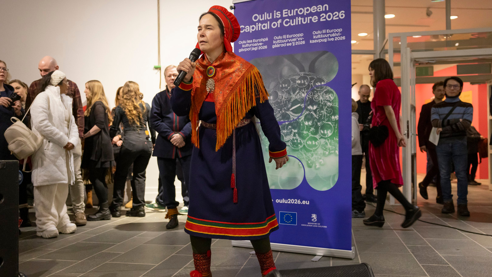 Anna Morottaja esiintymässä Eanangiella-suurnäyttelyn avajaisissa Oulun taidemuseolla 16.1.2026. Dálvemánnu-festivaalilla hän esiintyy 7. helmikuuta. Kuva: Petteri Löppönen / Oulu2026