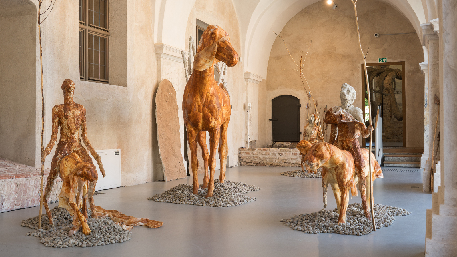 Kuvanveistäjä Edith Karlsonin näyttelyssä kävijä kohtaa nelimetrisiä jättiläisiä, salin ylle kaareutuvan luurangon ja kohti vääjäämätöntä kohtaloaan ratsastavan armeijan. Linnut ja muut eläimet tuijottavat hiljaisina vastaan. Kaivon äärellä lepäilevät merenneidot ovat nousseet vedestä todistamaan, mitä ihminen on merelle ja maalle tehnyt.