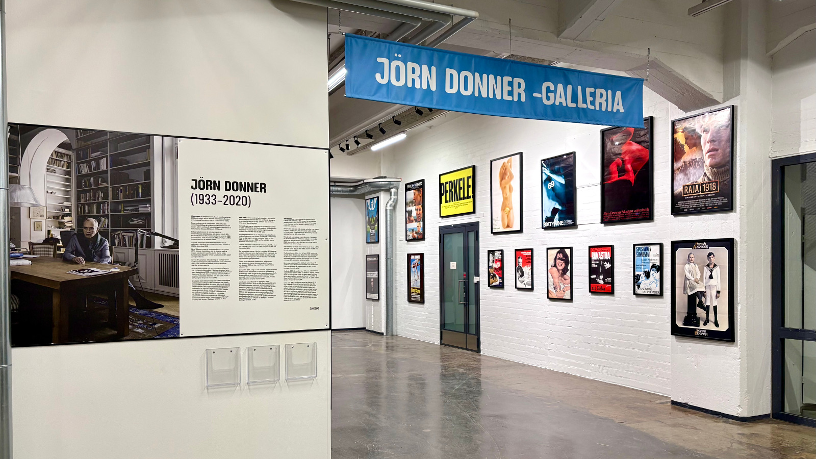 Gallerian julisteet kattavat Jörn Donnerin elokuvauran esikoisfiktiosta Syyskuinen sunnuntai (1963) hänen viimeiseen pitkään fiktioonsa Armi elää! (2015). Sattuvasti Armi elää! kuvattiin lähes kokonaan Kaapelitehtaan Pannuhallissa, joka on nykyään osa Tanssin taloa. Lisäksi galleriassa on esillä Donnerin yhdessä Erkki Seiron ja Jaakko Talaskiven kanssa ohjaama kulttimaineeseen noussut dokumentti Perkele! Kuvia Suomesta (1971) sekä Donnerin tuottamista elokuvista mm. Ingmar Bergmanin Fanny & Alexander (1982), joka palkittiin parhaan ulkomaisen elokuvan Oscarilla.