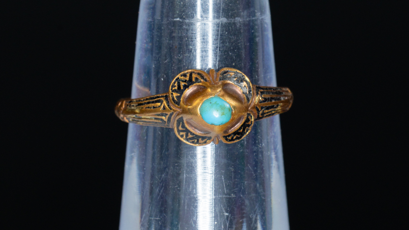 Kaarina Maununtyttären kultasormuksessa on mustaa emalikoristelua ja turkoosi. Kuva: Saarni Säilynoja