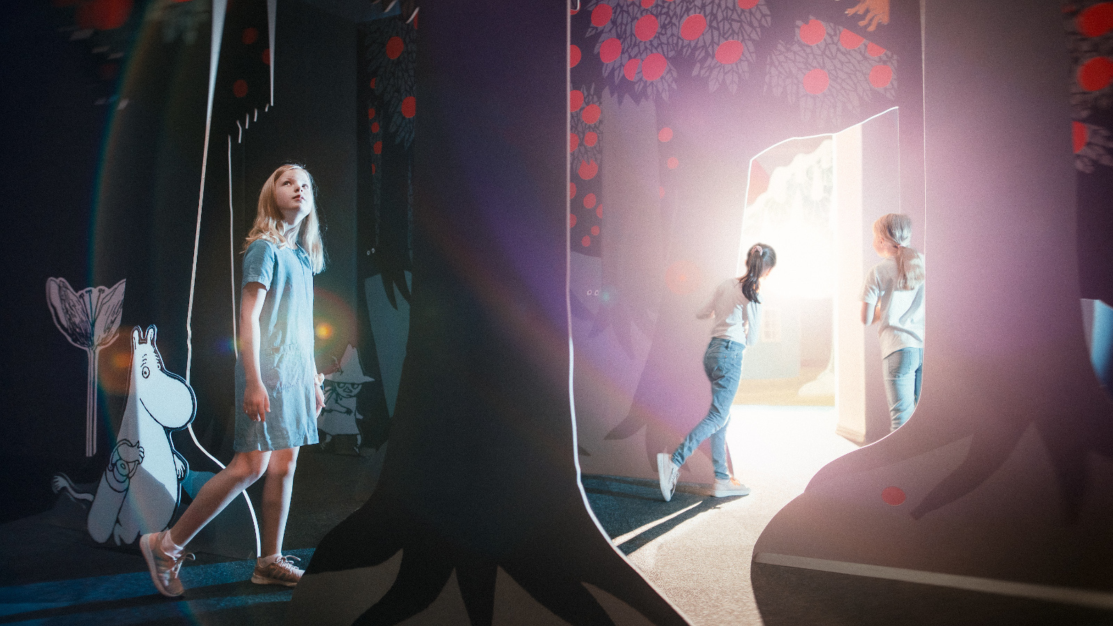 Rohkeus, rakkaus, vapaus! -näyttelyn taiteellinen ilme on Alexander Reichsteinin käsialaa ja pohjautuu Toven Janssonin alkuperäiskuvituksiin. Kuva: Jussi Hellsten / Museovirasto ©Moomin Characters™