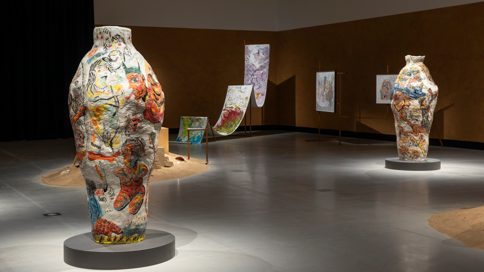 Lahden visuaalisten taiteiden museo Malvassa 10.4. avautuva Karim Boumjimarin Rakkauden riitit -näyttely esittelee keraamisia veistoksia, suurikokoisia piirroksia sekä runollisen Kevään jäljet -videoteoksen ensiesityksen. Voimakkaat teokset hehkuvat rituaalista energiaa ja tuovat esiin laajan joukon villejä ja paljaita hahmoja.