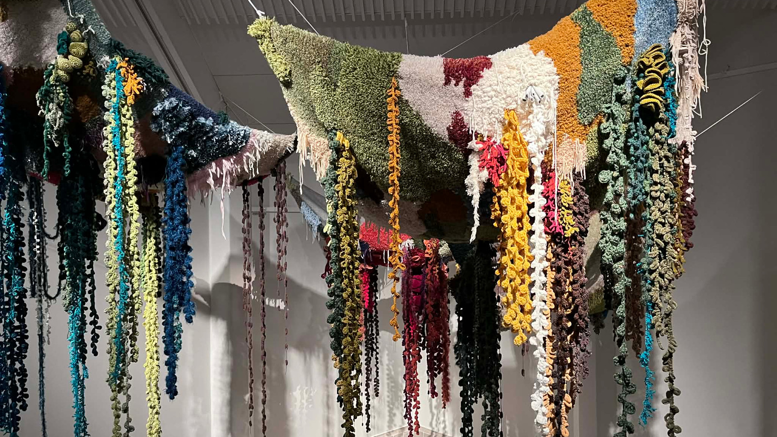 Kuvassa ryijyinstallaatio, minkä nimi on Piilo. Melkoinen hässäkkä. Kaikki Melissa Sammalvaaran työt olivat hienoja ja eniten pidin ryijyistä Pihka ja Hiillos. Ne täytyy nähdä ja kokea, millaiset fiilikset nousee pintaan.
