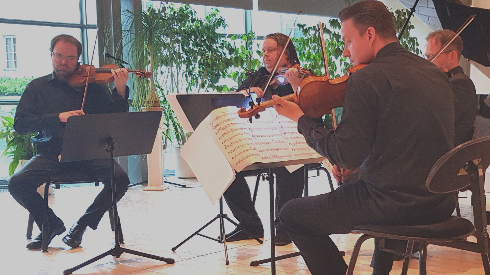 Neljä viulua, vas. Petteri Iivonen, Ville Koponen, Jukka Merjanen ja Matti Koponen. Kuva: cc-by-sa Amusa.fi