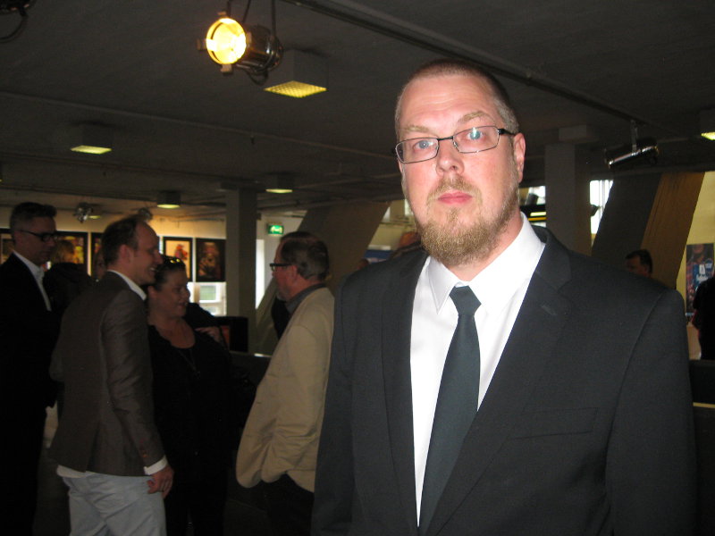 Tuomas Kyrö myönsi, että elokuvan kutsuvierasensi-ilta jännitti ja jännitys kasvoi iltaa kohti. Taustalla ohjaaja Dome Karukoski ja ainoa oikea uutisten lukija Arvi Lind. Kuva: cc-by-sa Marja Jähi-Salo, http//:www.amusa.fi
