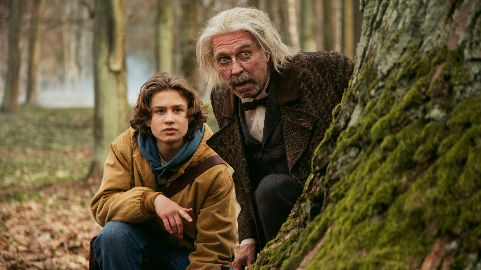 Kuvassa ovat vasemmalla metsässä kyykyssä suuren puunrungon vieressä Kuura Rossi ja hänen vieressään vähän ylempänä Martti suosalo pitkissä vaaleissa hiuksissa. Taustalla näkyy puunrunkoja.